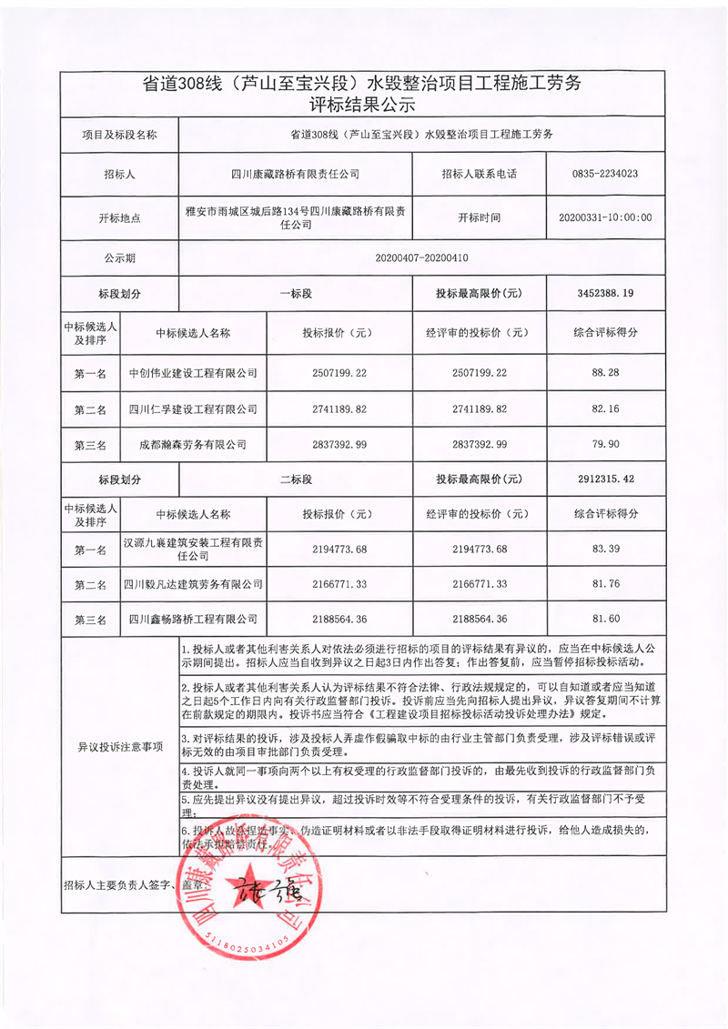 四川康藏路橋有限責(zé)任公司省道308線(xiàn)(蘆山至寶興段)水毀整治項(xiàng)目工程施工勞務(wù)評(píng)標(biāo)結(jié)果公示