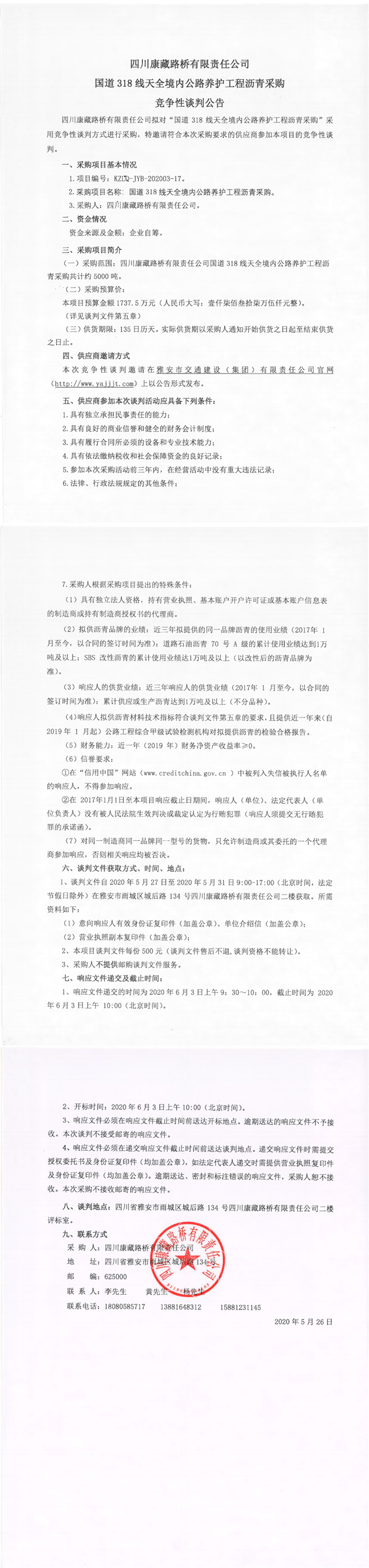 四川康藏路橋有限責(zé)任公司國道318線天全境內(nèi)公路養(yǎng)護(hù)工程瀝青采購競(jìng)爭(zhēng)性談判公告