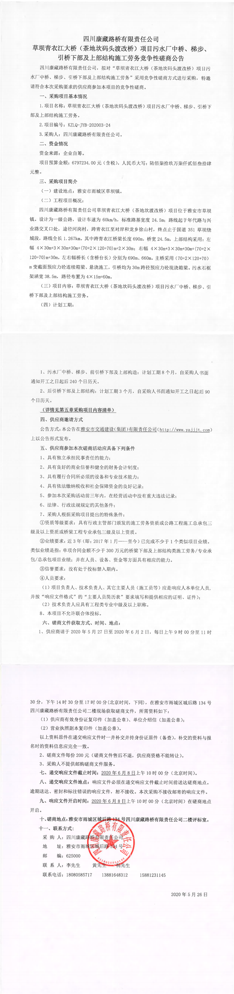 四川康藏路橋有限責(zé)任公司草壩青衣江大橋(茶地坎碼頭渡改橋)項(xiàng)目污水廠中橋、梯步、引橋下部及上部結(jié)構(gòu)施工勞務(wù)競爭性磋商公告