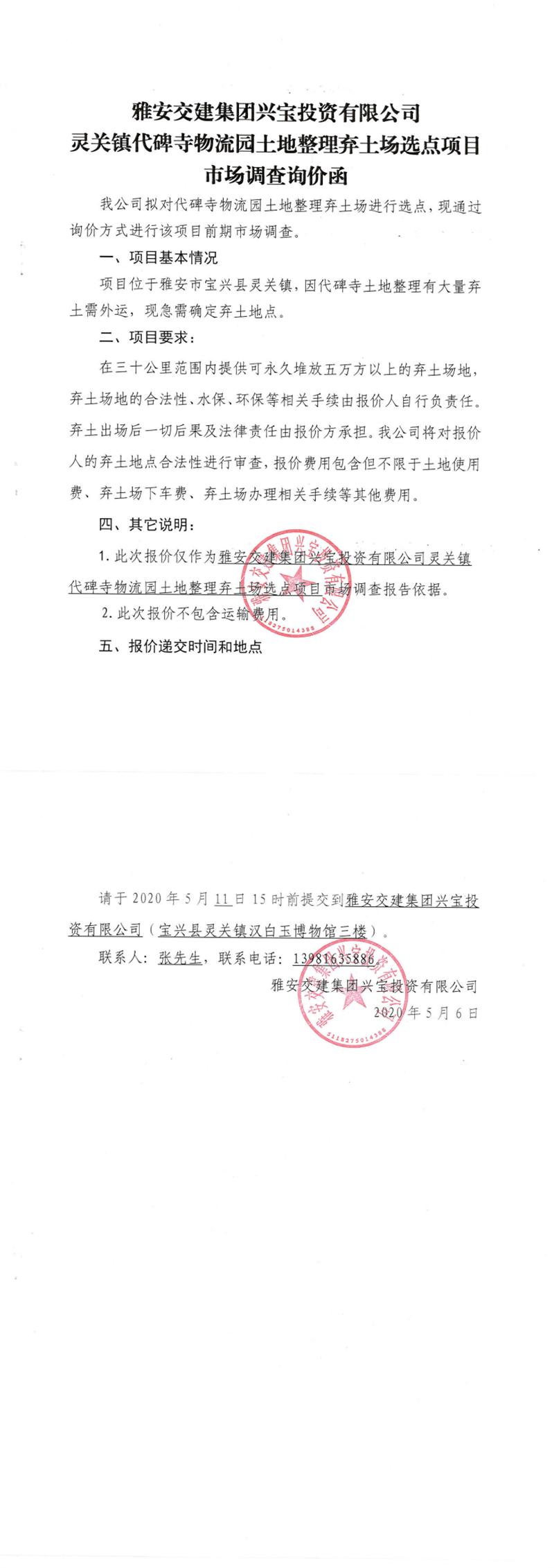 雅安交建集團興寶投資有限公司靈關鎮(zhèn)代碑寺物流園土地整理棄土場選點項目市場調查詢價函