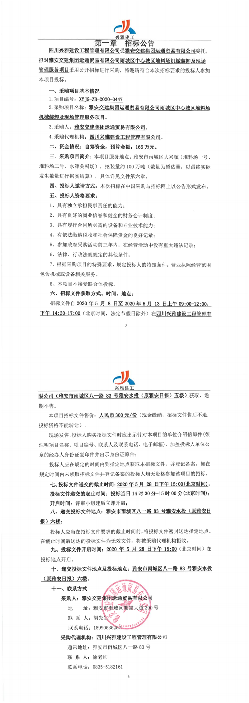 雅安交建集團運通貿易有限公司雨城區(qū)中心城區(qū)堆料場機械裝卸及現場管理服務項目招標公告