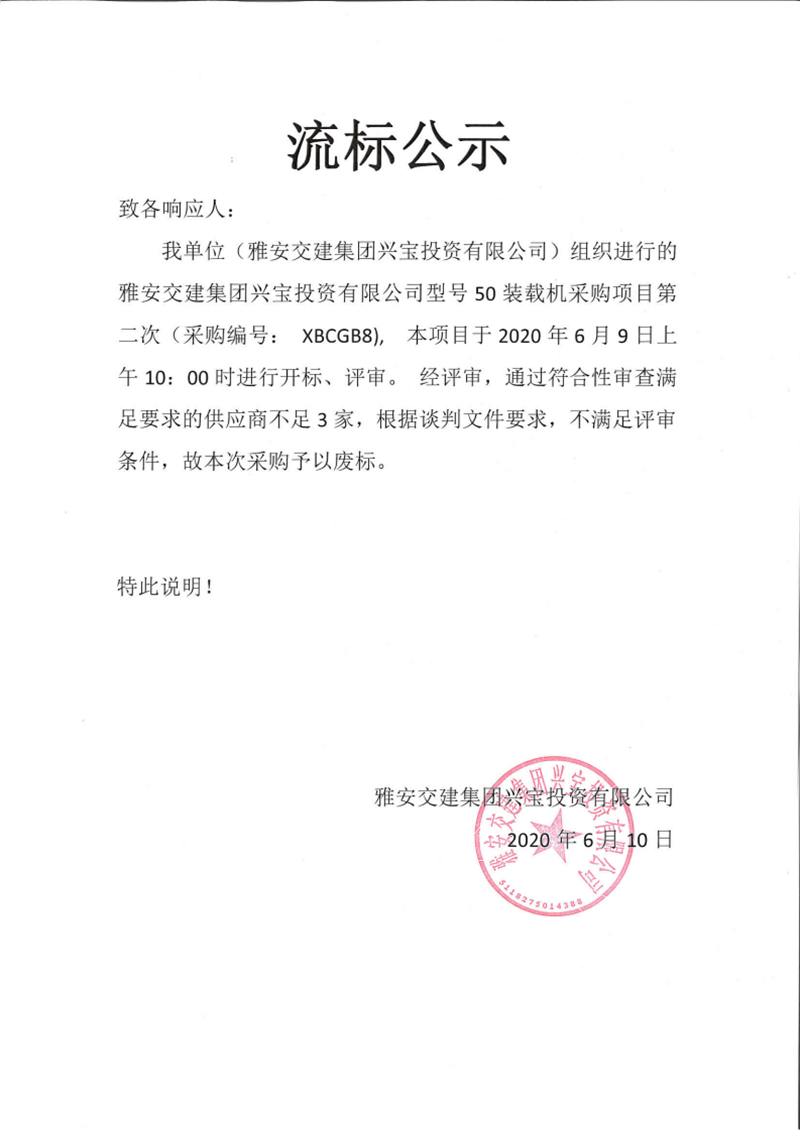 雅安交建集團(tuán)興寶投資有限公司型號50裝載機(jī)采購項(xiàng)目第二次流標(biāo)公示