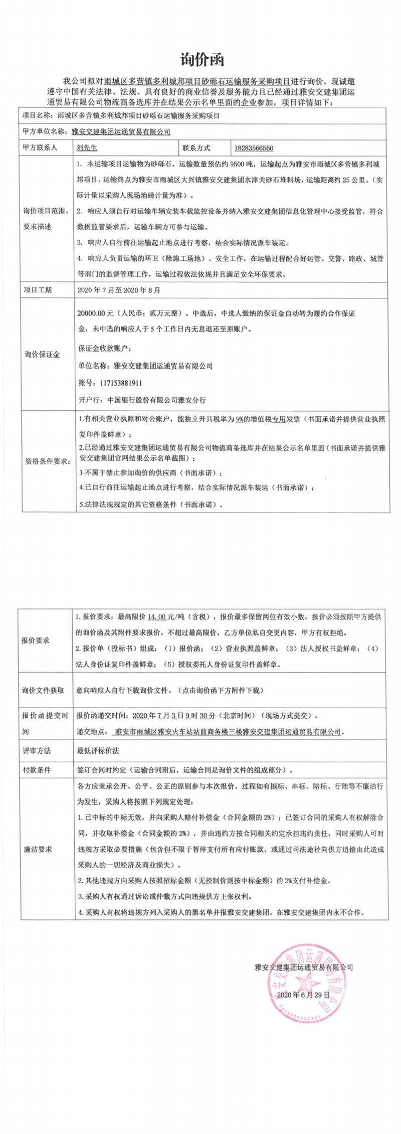 雅安交建集團運通貿(mào)易有限公司雨城區(qū)多營鎮(zhèn)多利城邦項目砂礫石運輸服務采購項目詢價函