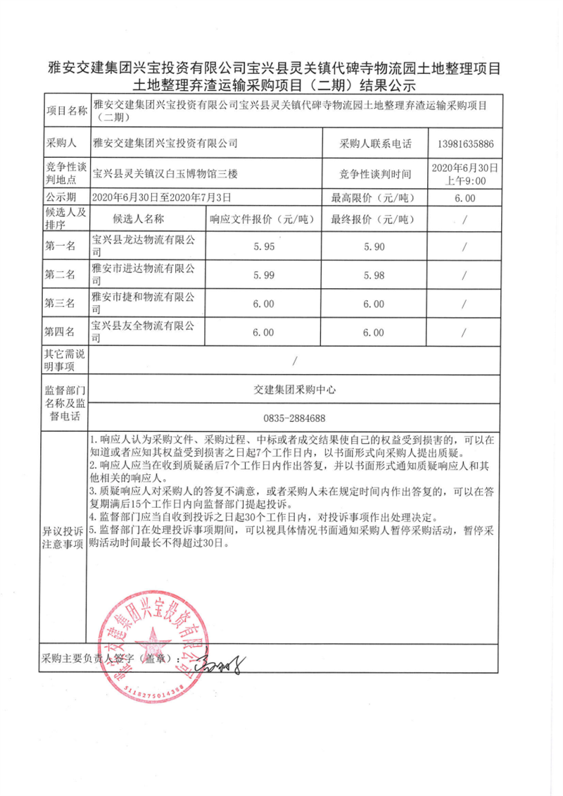 雅安交建集團(tuán)興寶投資有限公司寶興縣靈關(guān)鎮(zhèn)代碑寺物流園土地整理項(xiàng)目土地整理?xiàng)壴\(yùn)輸采購(gòu)項(xiàng)目(二期)結(jié)果公示