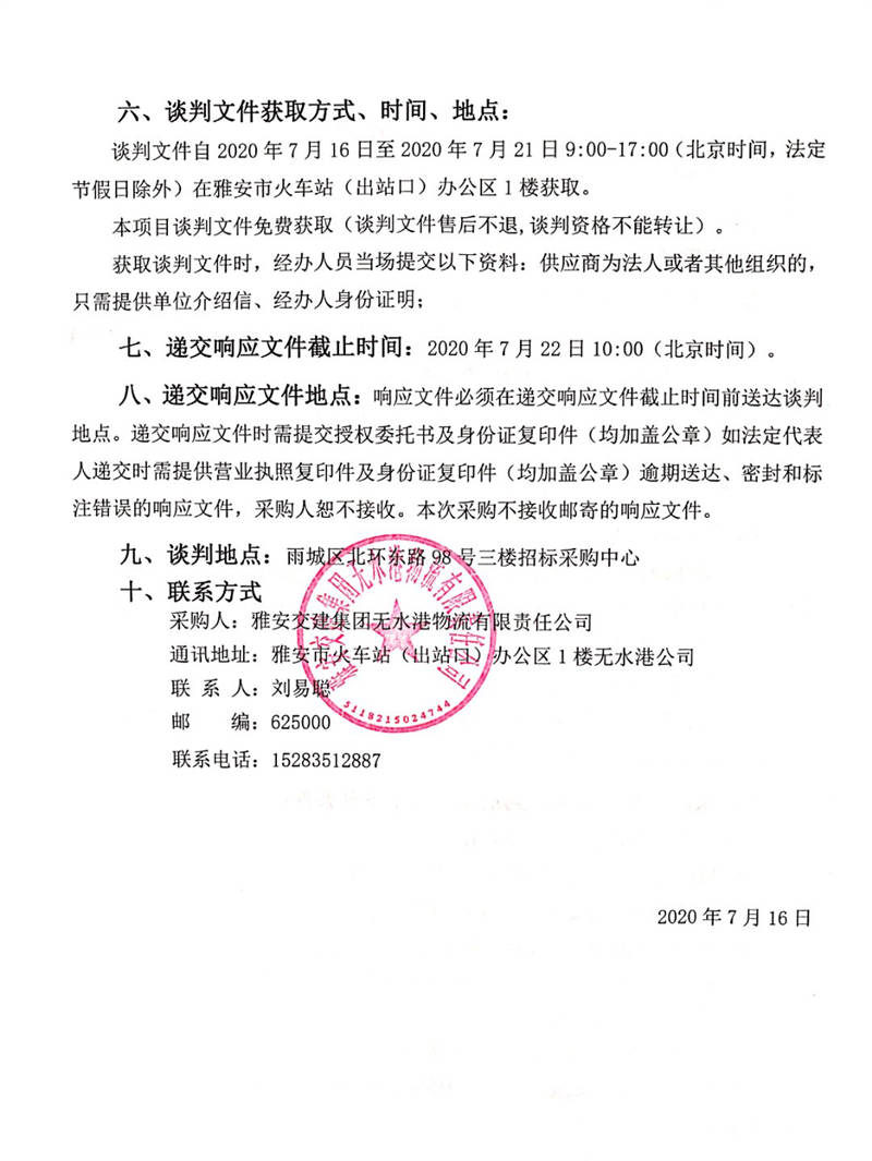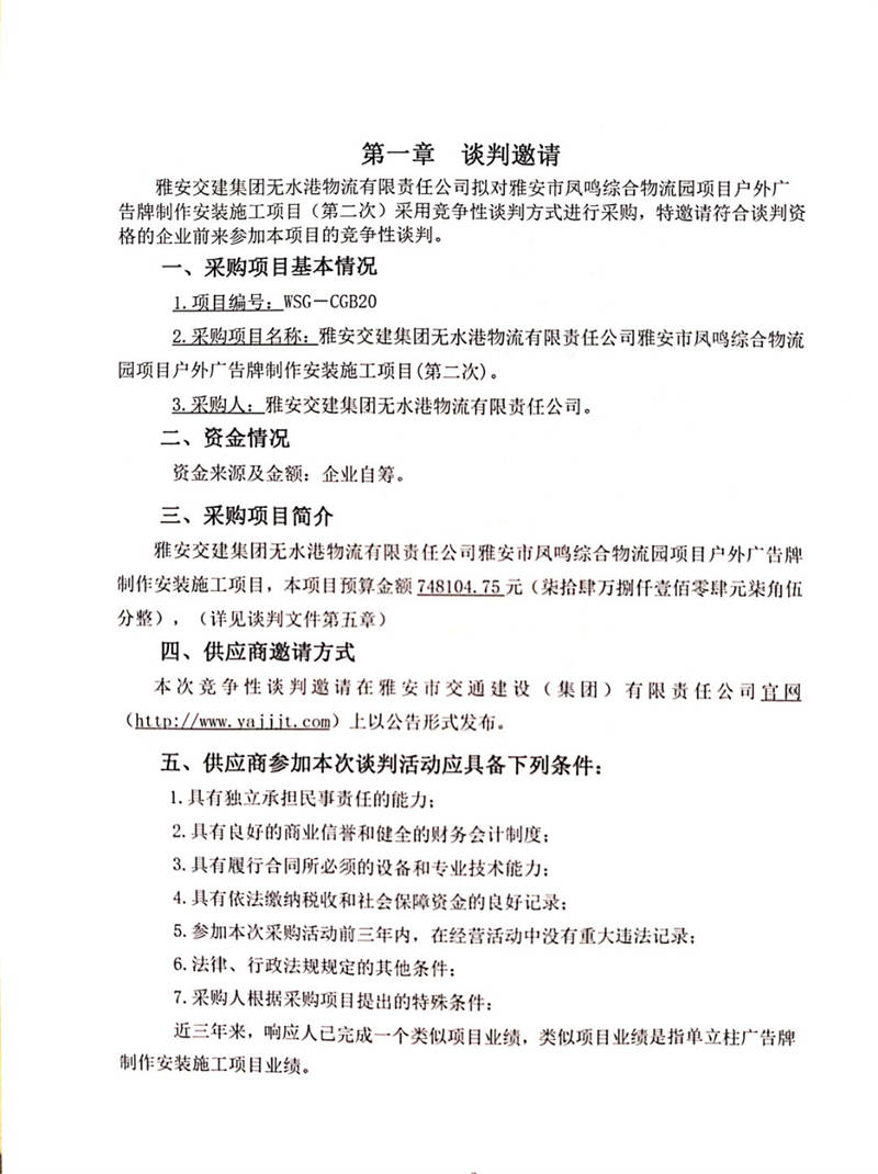 雅安交建集團(tuán)無水港物流有限責(zé)任公司雅安市鳳鳴綜合物流園項(xiàng)目戶外廣告牌制作安裝施工項(xiàng)目(第二次)競(jìng)爭性談判公告