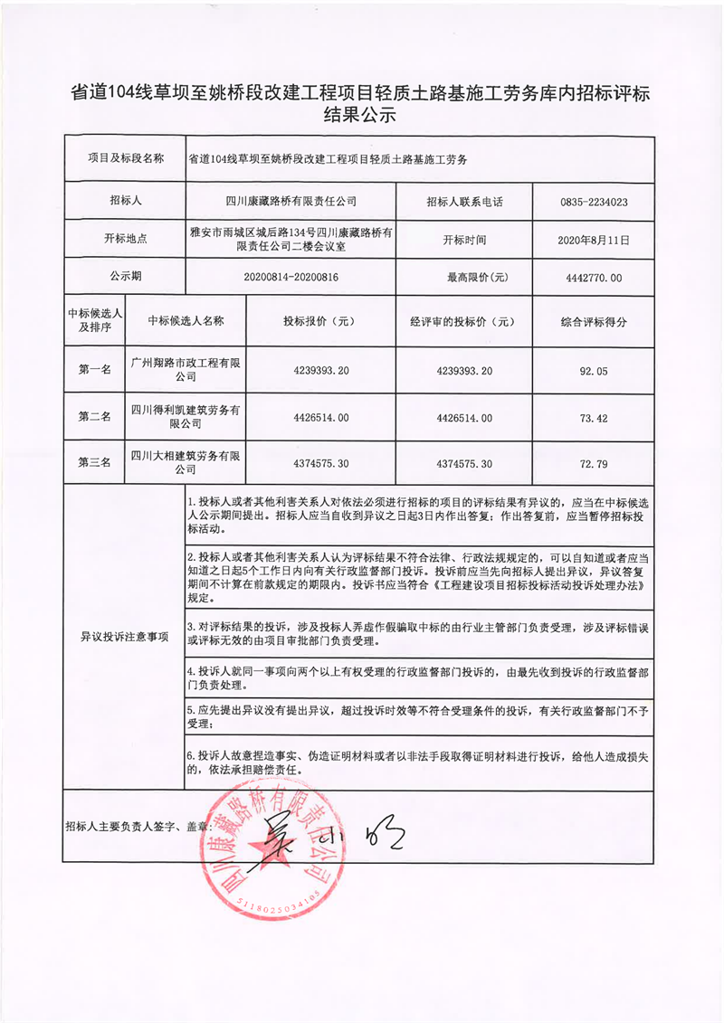 四川康藏路橋有限責(zé)任公司省道104線草壩至姚橋段改建工程項(xiàng)目輕質(zhì)土路基施工勞務(wù)庫內(nèi)招標(biāo)評標(biāo)結(jié)果公示