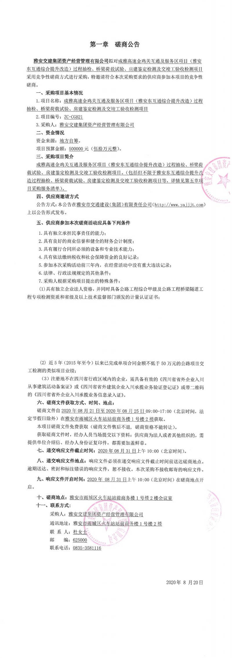 雅安交建集團資產經營管理有限公司成雅高速金雞關互通及服務區(qū)項目(雅安東互通綜合提升改造)過程抽檢、橋梁荷載試驗、房建鑒定檢測及交竣工驗收檢測項目磋商公告