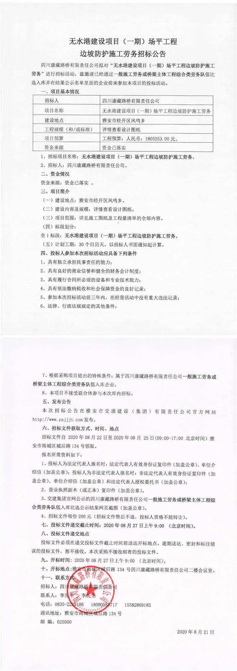 四川康藏路橋有限責(zé)任公司無水港建設(shè)項目(一期)場平工程邊坡防護施工勞務(wù)招標公告