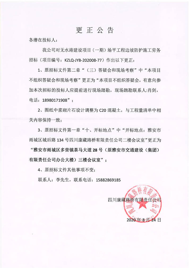 四川康藏路橋有限責(zé)任公司無水港建設(shè)項(xiàng)目(一期)場平工程邊坡防護(hù)施工勞務(wù)招標(biāo)更正公告