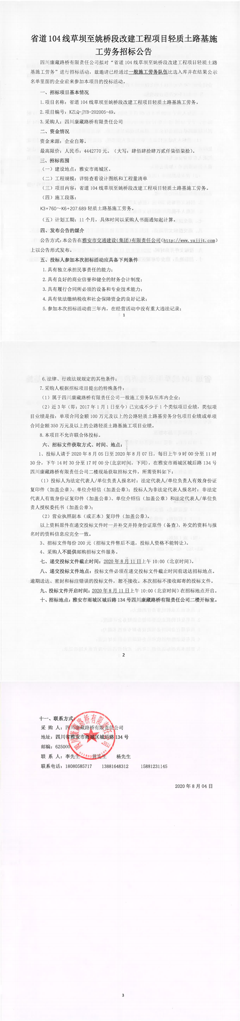 四川康藏路橋有限責任公司省道104線草壩至姚橋段改建工程項目輕質土路基施工勞務招標公告