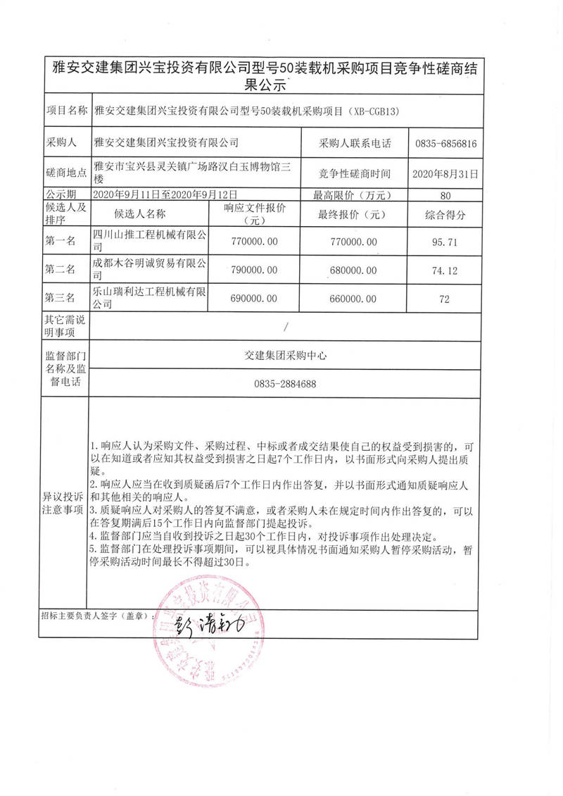 雅安交建集團(tuán)興寶投資有限公司型號50裝載機(jī)采購項目競爭性磋商結(jié)果公示