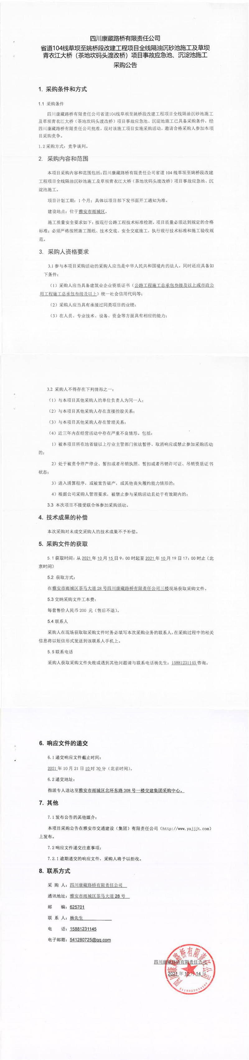四川康藏路橋有限責(zé)任公司省道104線草壩至姚橋段改建項(xiàng)目全線隔油沉砂池施工及草壩青衣江大橋(茶地坎碼頭渡改橋)項(xiàng)目事故應(yīng)急池、沉淀池施工采購公告