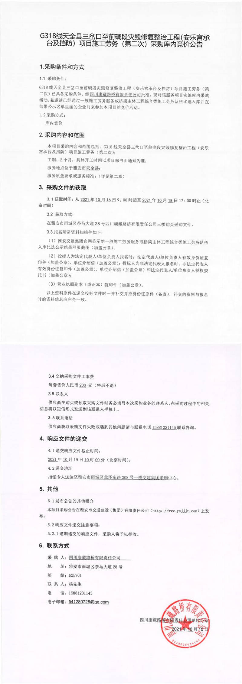 四川康藏路橋有限責任公司G318線天全縣三岔口至前碉段災毀修復整治工程(安樂宮承臺及擋防)項目施工勞務(第二次)采購庫內競價公告