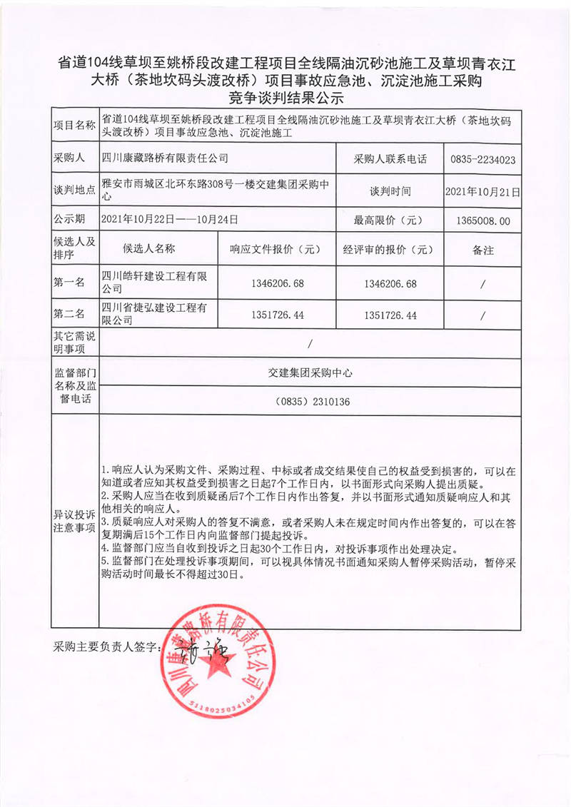 四川康藏路橋有限責(zé)任公司省道104線草壩至姚橋段改建工程項(xiàng)目全線隔油沉砂池施工及草壩青衣江大橋(茶地坎碼頭渡改橋)項(xiàng)目事故應(yīng)急池、沉淀池施工采購競(jìng)爭(zhēng)談判結(jié)果公示