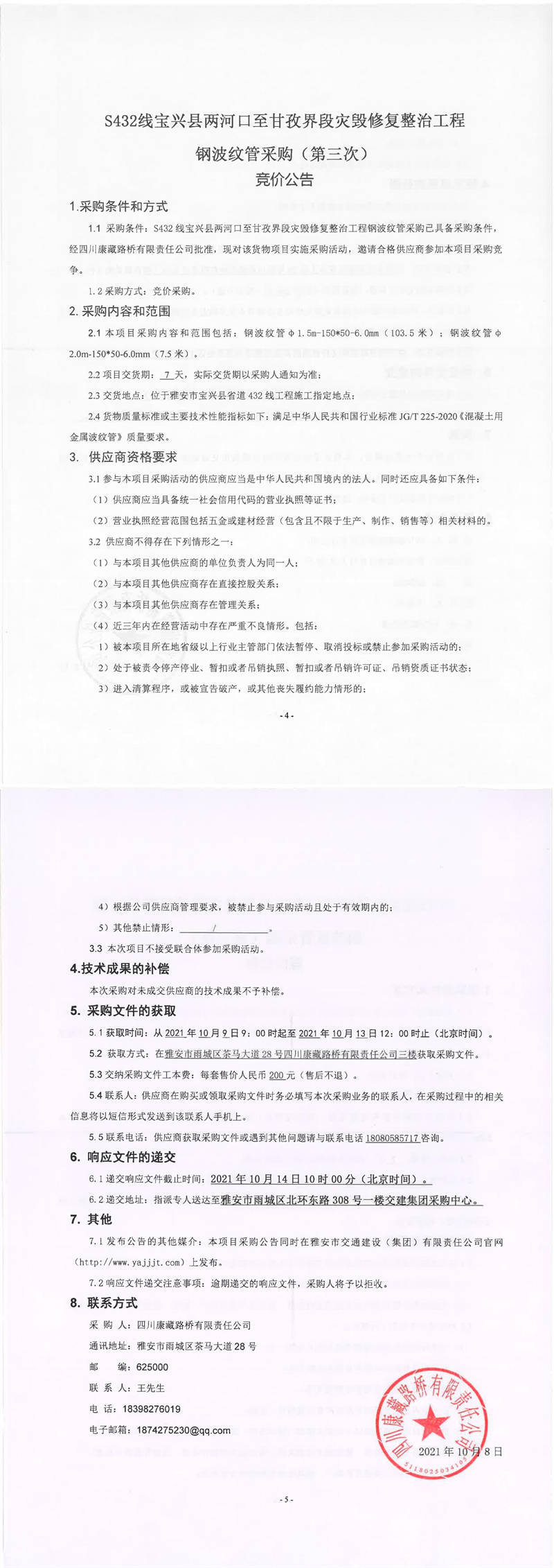 四川康藏路橋有限責(zé)任公司S432線寶興縣兩河口至甘孜界段災(zāi)毀修復(fù)整治工程鋼波紋管采購(第三次)競價(jià)公告