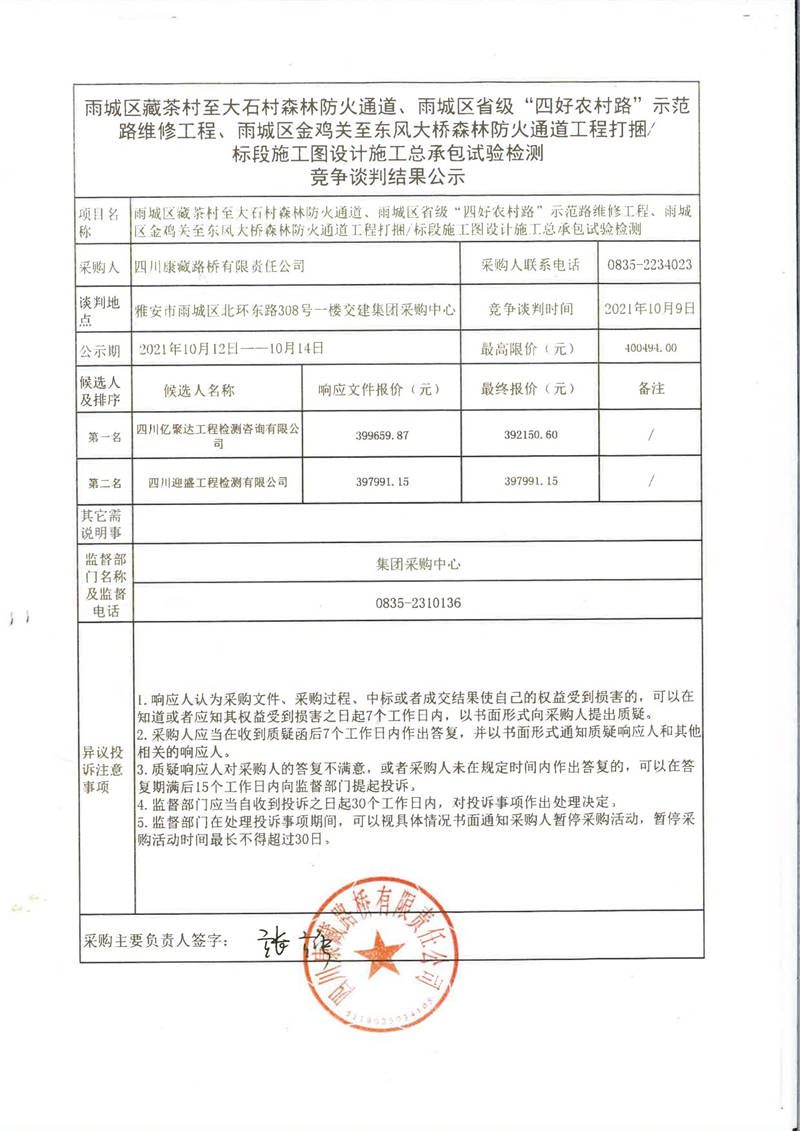 四川康藏路橋有限責(zé)任公司雨城區(qū)藏茶村至大石村森林防火通道、雨城區(qū)省級“四好農(nóng)村路”示范路維修工程、雨城區(qū)金雞關(guān)至東風(fēng)大橋森林防火通道工程打捆/標(biāo)段施工圖設(shè)計(jì)施工總承包試驗(yàn)檢測競爭談判結(jié)果公示