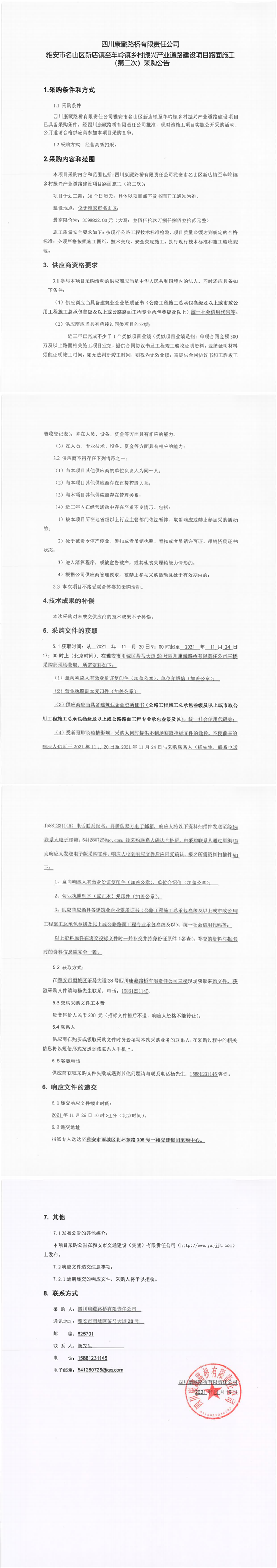 四川康藏路橋有限責(zé)任公司雅安市名山區(qū)新店鎮(zhèn)至車(chē)嶺鎮(zhèn)鄉(xiāng)村振興產(chǎn)業(yè)道路建設(shè)項(xiàng)目路面施工(第二次)采購(gòu)公告