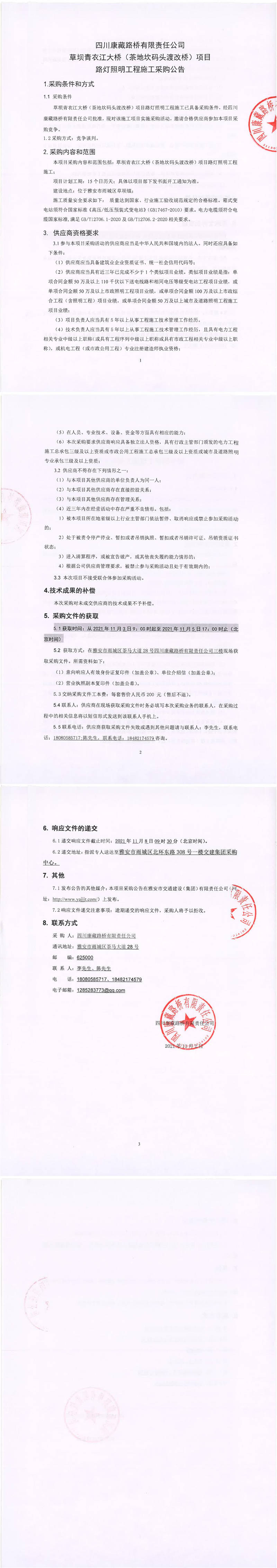 四川康藏路橋有限責(zé)任公司草壩青衣江大橋(茶地坎碼頭渡改橋)項(xiàng)目路燈照明工程施工采購公告