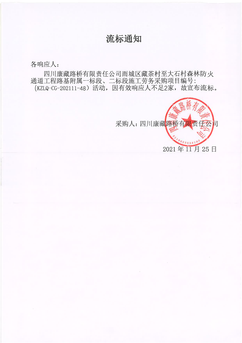 四川康藏路橋有限責任公司雨城區(qū)藏茶村至大石村森林防火通道工程路基附屬一標段、二標段施工勞務流標通知