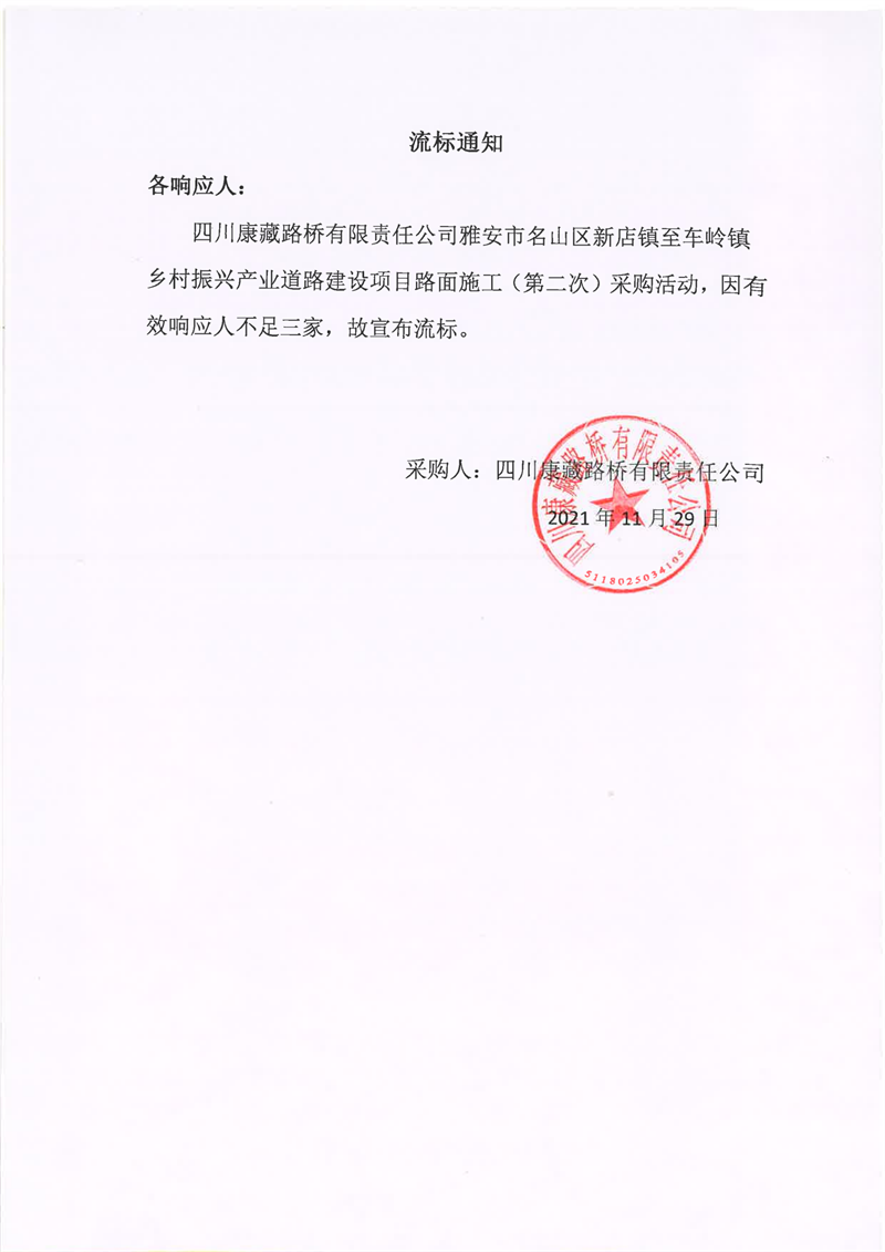 四川康藏路橋有限責(zé)任公司雅安市名山區(qū)新店鎮(zhèn)至車嶺鎮(zhèn)鄉(xiāng)村振興產(chǎn)業(yè)道路建設(shè)項目路面施工(第二次)流標(biāo)通知