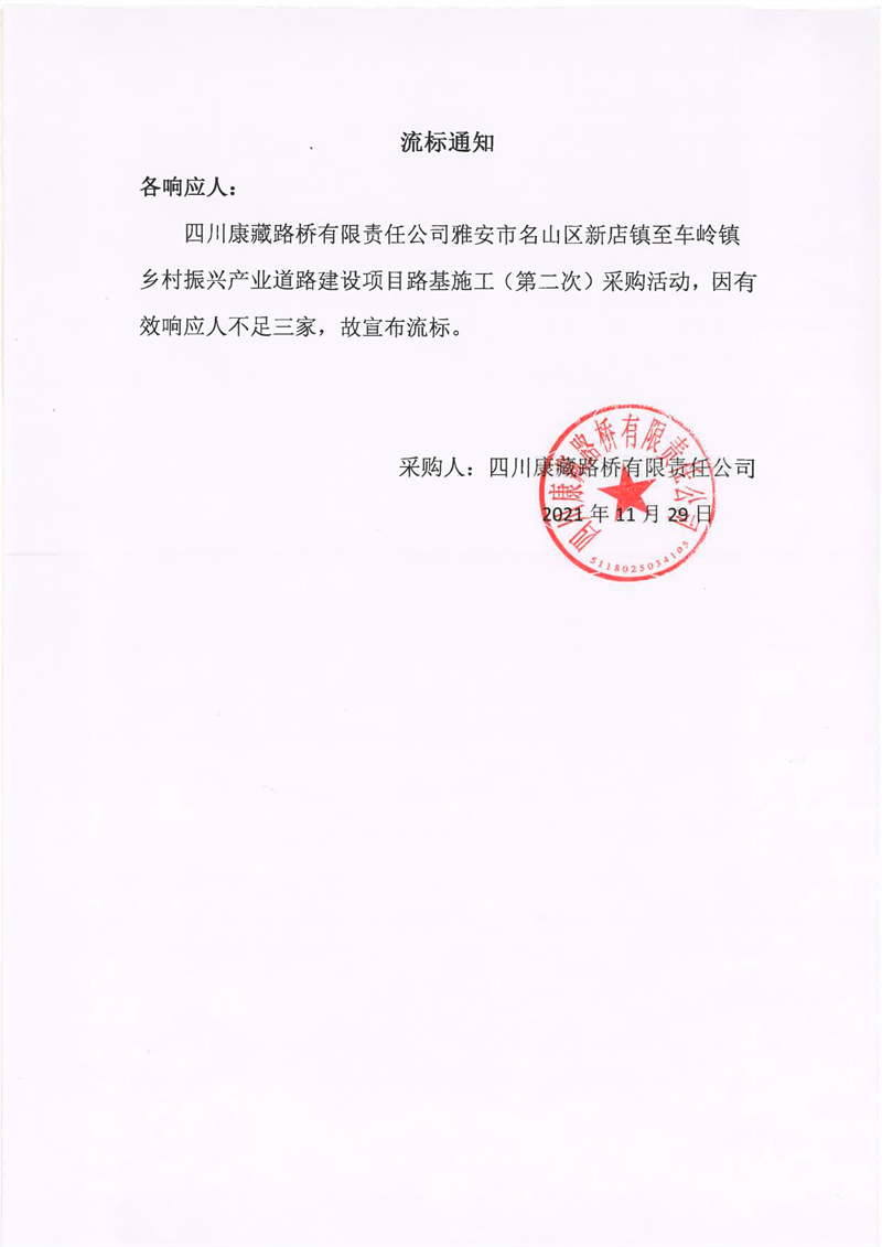 四川康藏路橋有限責任公司雅安市名山區(qū)新店鎮(zhèn)至車嶺鎮(zhèn)鄉(xiāng)村振興產(chǎn)業(yè)道路建設(shè)項目路基施工(第二次)流標通知