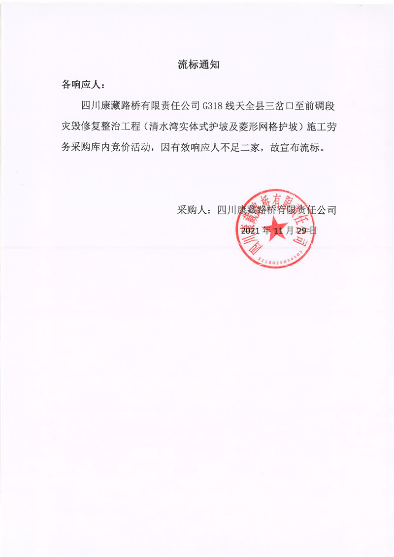 四川康藏路橋有限責(zé)任公司G318線天全縣三岔口至前碉段災(zāi)毀修復(fù)整治工程(清水灣實體式護(hù)坡及菱形網(wǎng)格護(hù)坡)施工勞務(wù)采購流標(biāo)通知