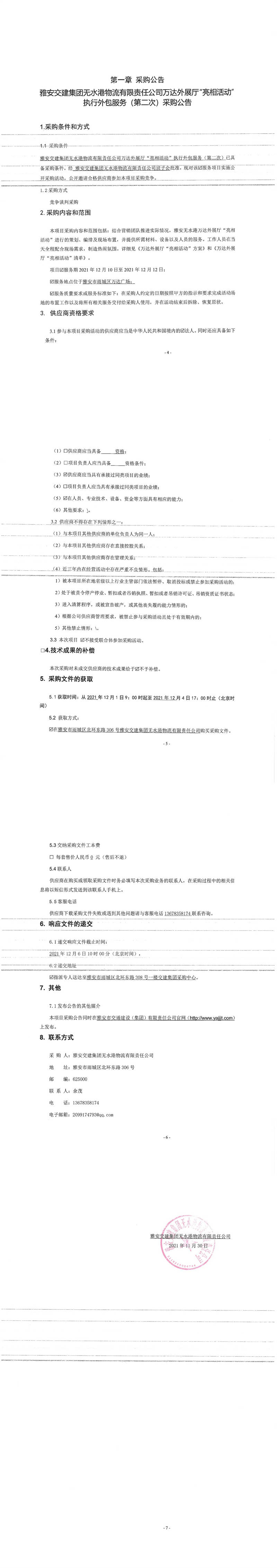 雅安交建集團(tuán)無水港物流有限責(zé)任公司萬達(dá)外展廳“亮相活動(dòng)”執(zhí)行外包服務(wù)(第二次)采購公告