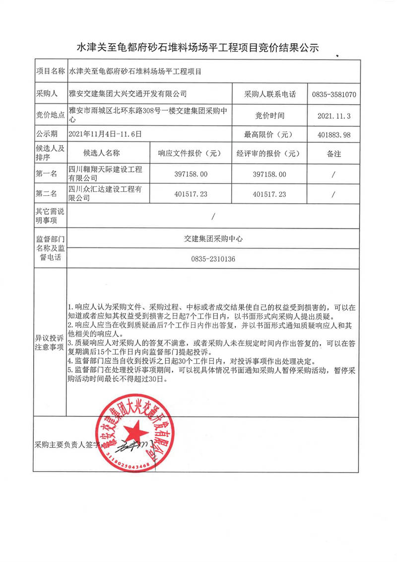 雅安交建集團(tuán)大興交通開發(fā)有限公司水津關(guān)至龜都府砂石堆料場(chǎng)場(chǎng)平工程項(xiàng)目競(jìng)價(jià)結(jié)果公示
