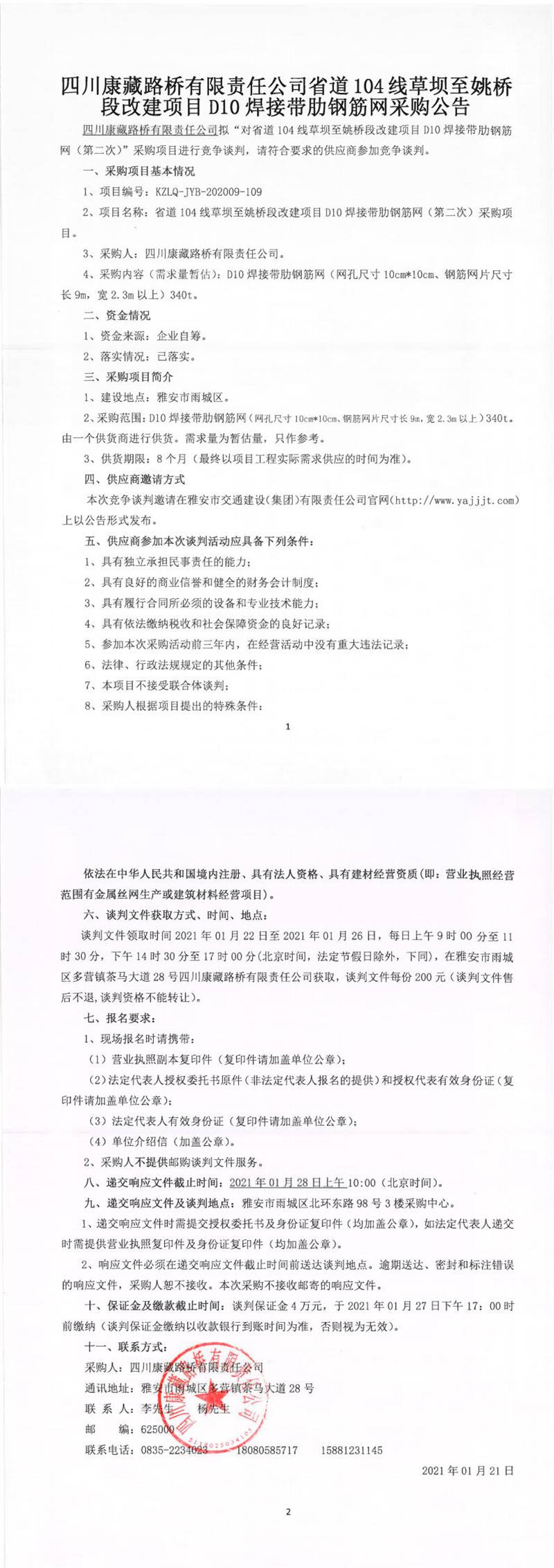 四川康藏路橋有限責任公司省道104線草壩至姚橋段改建項目D10焊接帶肋鋼筋網(wǎng)(第二次)采購公告