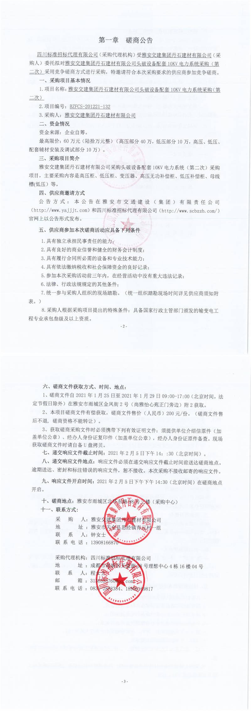 雅安交建集團丹石建材有限公司頭破設(shè)備配套10KV電力系統(tǒng)采購(第二次)競爭磋商公告