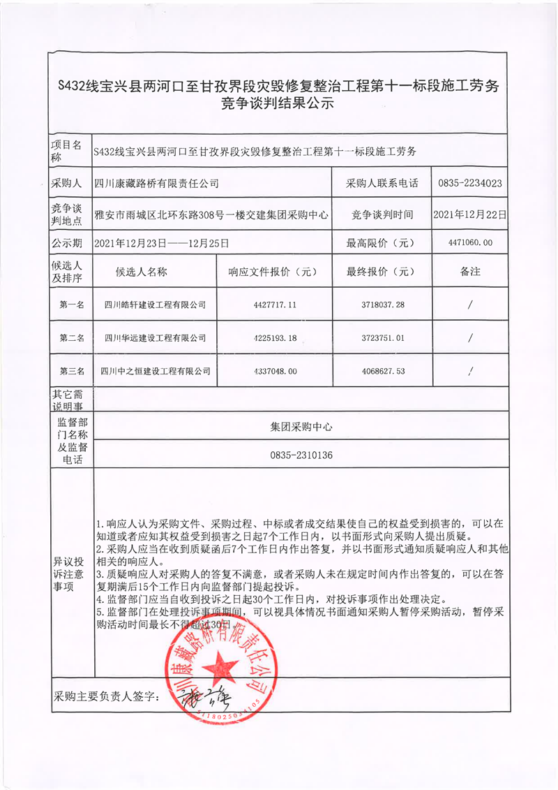 四川康藏路橋有限責任公司S432線寶興縣兩河口至甘孜界段災毀修復整治工程第十一標段施工勞務競爭談判結果公示