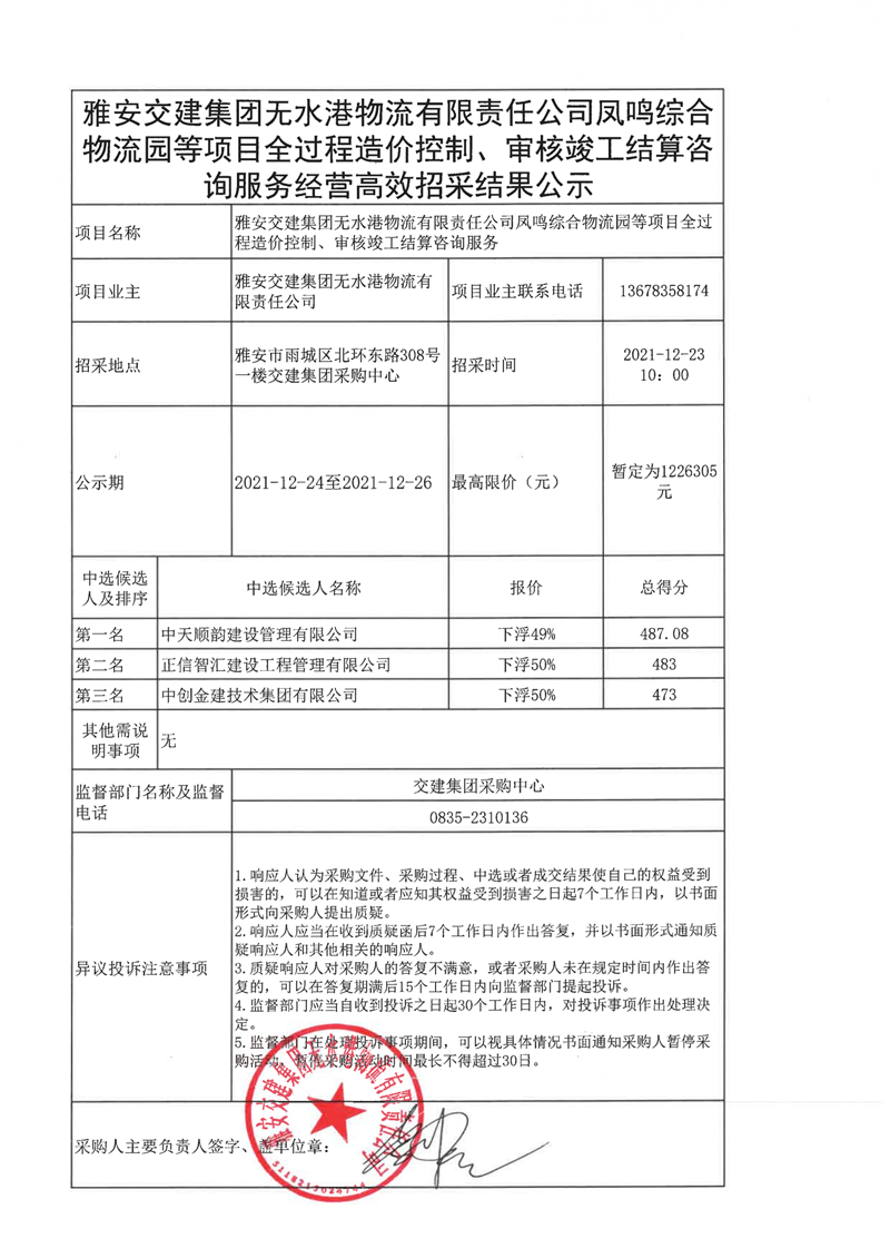 雅安交建集團(tuán)無(wú)水港物流有限責(zé)任公司鳳鳴綜合物流等項(xiàng)目全過(guò)程造價(jià)控制、審核竣工結(jié)算咨詢服務(wù)經(jīng)營(yíng)高效招采結(jié)果公示