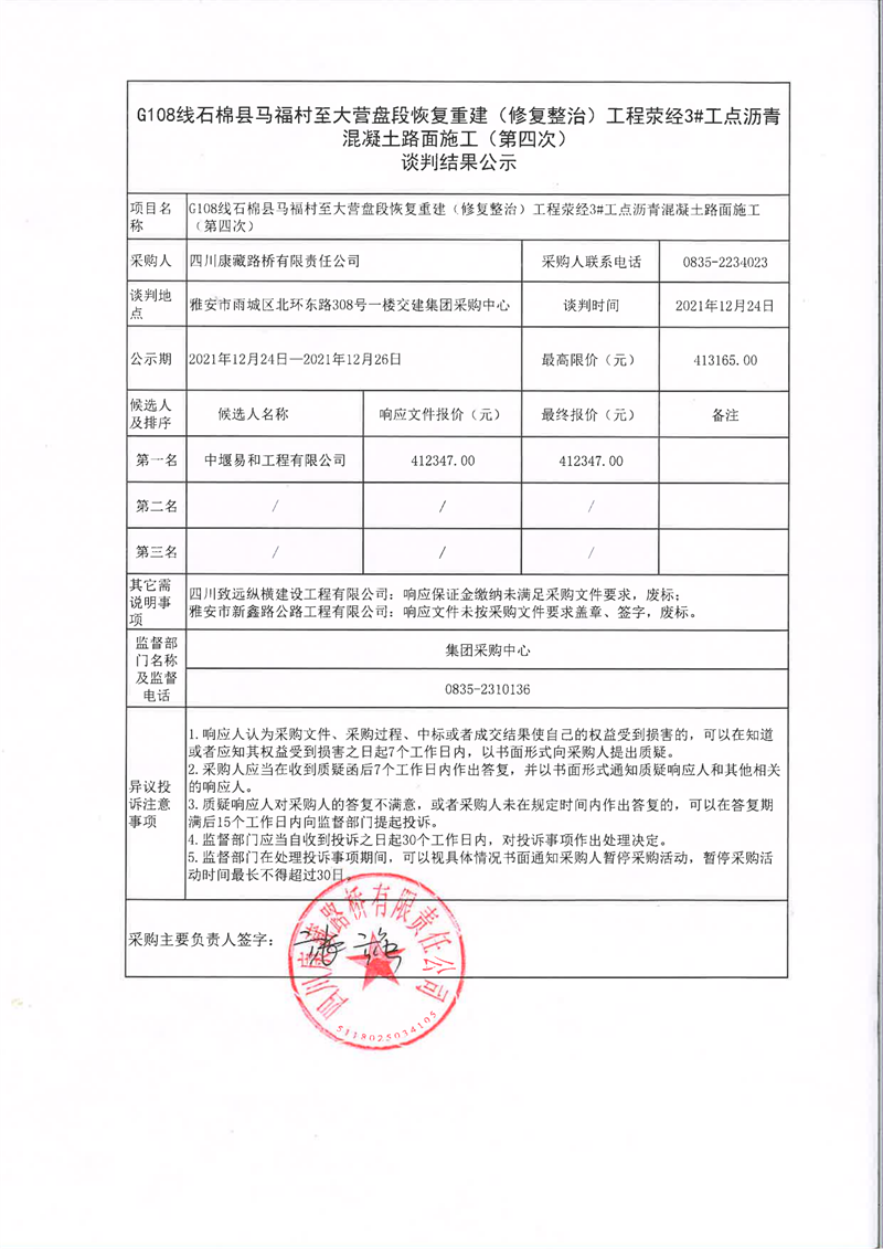 四川康藏路橋有限責任公司G108線石棉縣馬福村至大營盤段恢復(fù)重建(修復(fù)整治)工程滎經(jīng)3#工點瀝青混凝土路面施工(第四次)談判結(jié)果公示