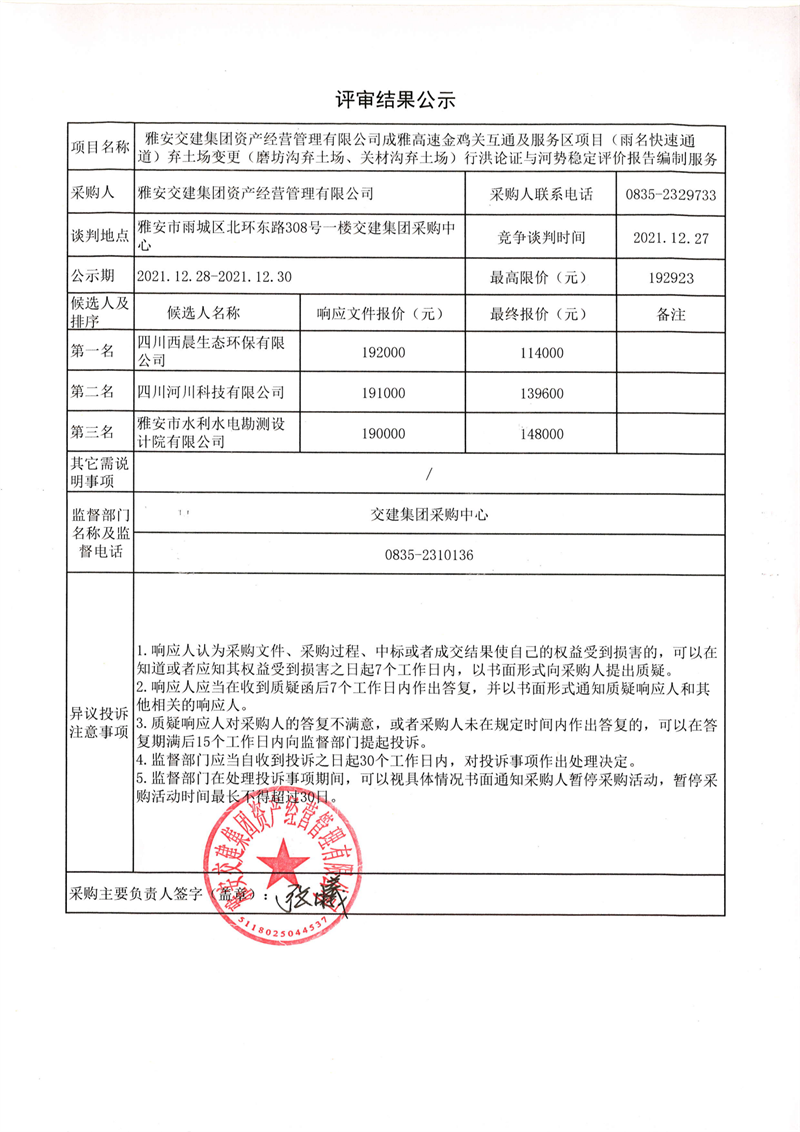 雅安交建集團(tuán)資產(chǎn)經(jīng)營(yíng)管理有限公司成雅高速金雞關(guān)互通及服務(wù)區(qū)項(xiàng)目(雨名快速通道)棄土場(chǎng)變更(磨坊溝棄土場(chǎng)、關(guān)材溝棄土場(chǎng))行洪論證與河勢(shì)穩(wěn)定評(píng)價(jià)報(bào)告編制服務(wù)評(píng)審結(jié)果公示