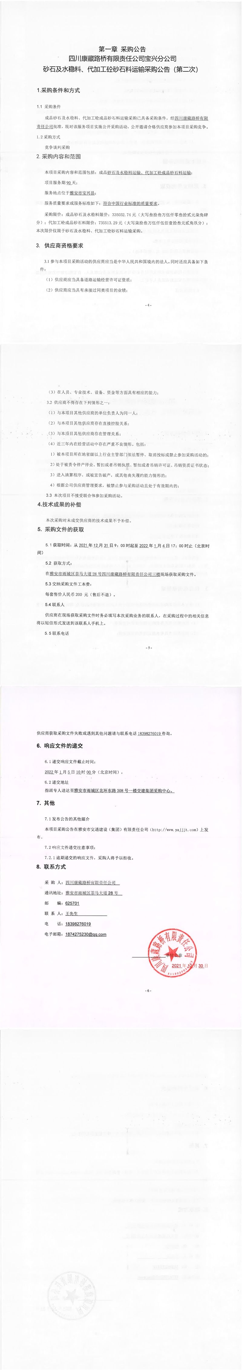 四川康藏路橋有限責(zé)任公司寶興分公司砂石及水穩(wěn)料、代加工砼砂石料運輸采購公告(第二次)