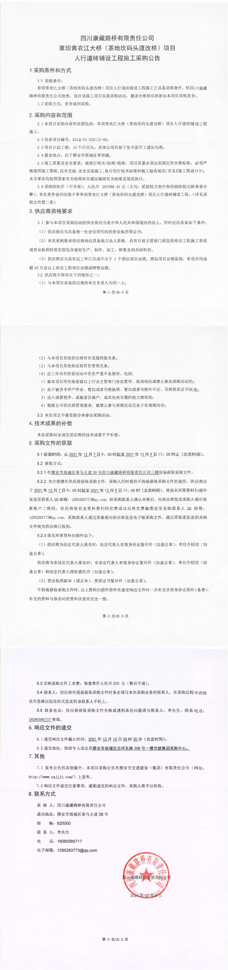 四川康藏路橋有限責(zé)任公司草壩青衣江大橋(茶地坎碼頭渡改橋)項(xiàng)目人行道磚鋪設(shè)工程施工采購公告