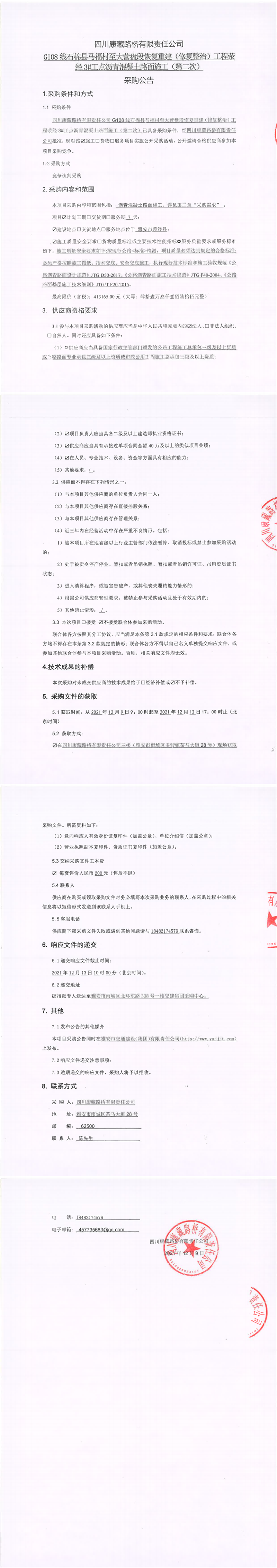 四川康藏路橋有限責(zé)任公司G108線(xiàn)石棉縣馬福村至大營(yíng)盤(pán)段恢復(fù)重建(修復(fù)整治)工程滎經(jīng)3#工點(diǎn)瀝青混凝土路面施工(第二次)采購(gòu)公告