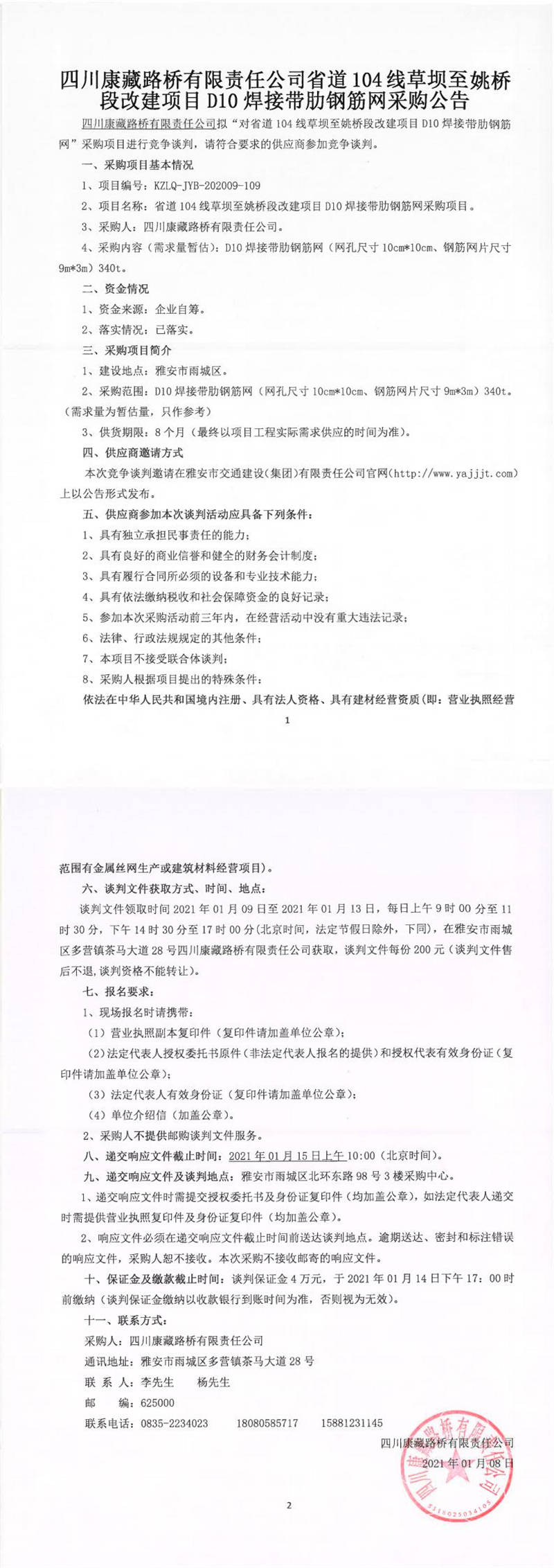 四川康藏路橋有限責(zé)任公司省道104線草壩至姚橋段改建項(xiàng)目D10焊接帶肋鋼筋網(wǎng)采購(gòu)公告