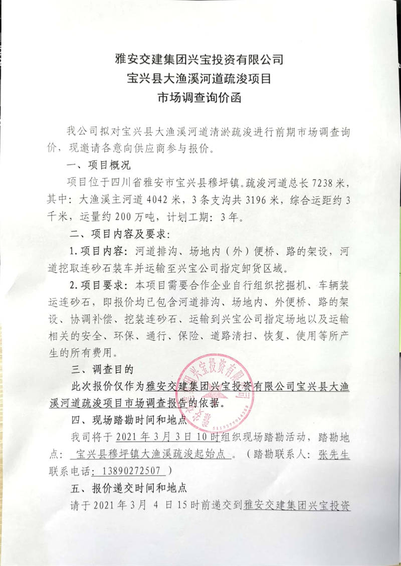 雅安交建集團(tuán)興寶投資有限公司寶興縣大漁溪河道疏浚項(xiàng)目市場(chǎng)調(diào)查詢價(jià)公告