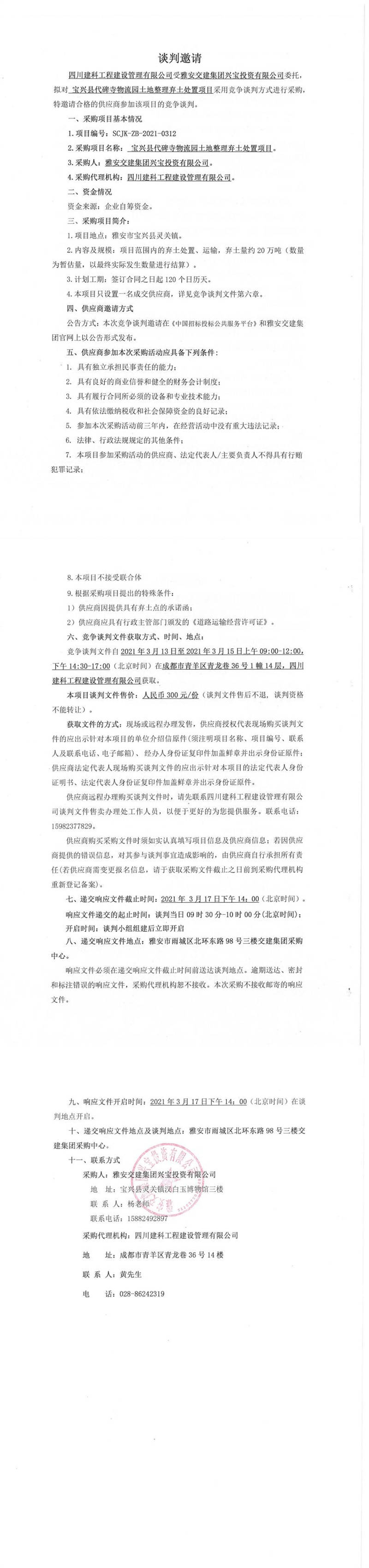 雅安交建集團(tuán)興寶投資有限公司寶興縣代碑寺物流園土地整理?xiàng)壨撂幹庙?xiàng)目競爭談判公告
