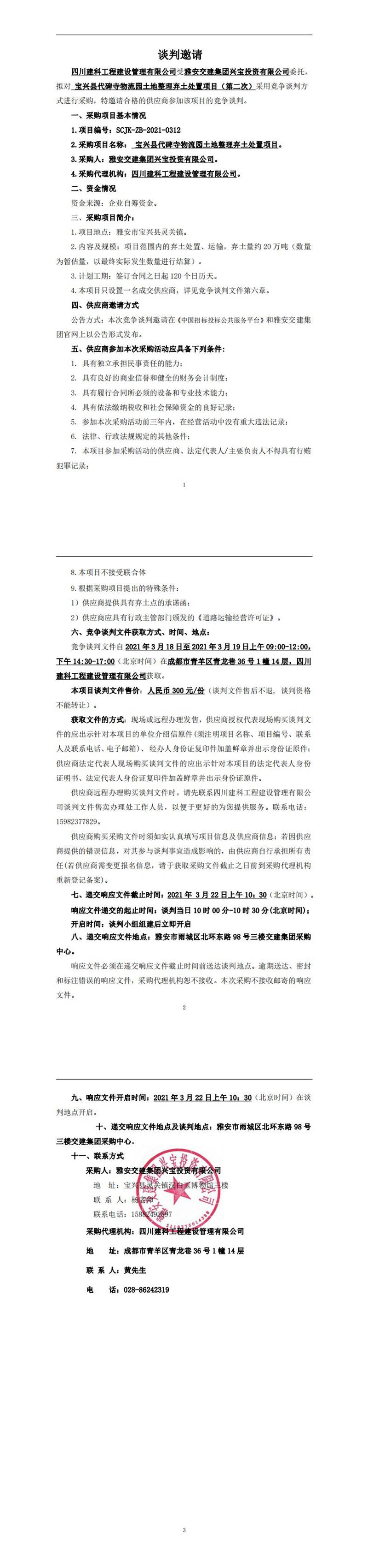 雅安交建集團(tuán)興寶投資有限公司寶興縣代碑寺物流園土地整理?xiàng)壨撂幹庙?xiàng)目(第二次)競爭談判公告
