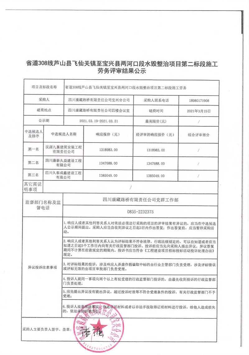 四川康藏路橋有限責(zé)任公司寶興分公司省道308線蘆山縣飛仙關(guān)鎮(zhèn)至寶興縣兩河口段水毀整治項(xiàng)目第二標(biāo)段施工勞務(wù)評(píng)審結(jié)果公示