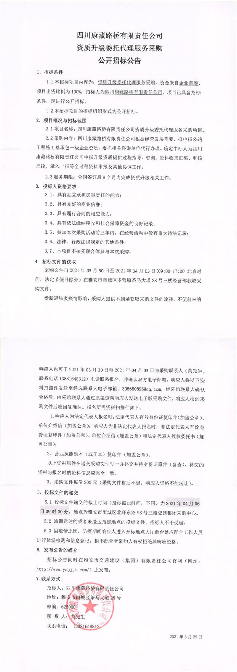 四川康藏路橋有限責任公司資質(zhì)升級委托代理服務(wù)采購公開招標公告