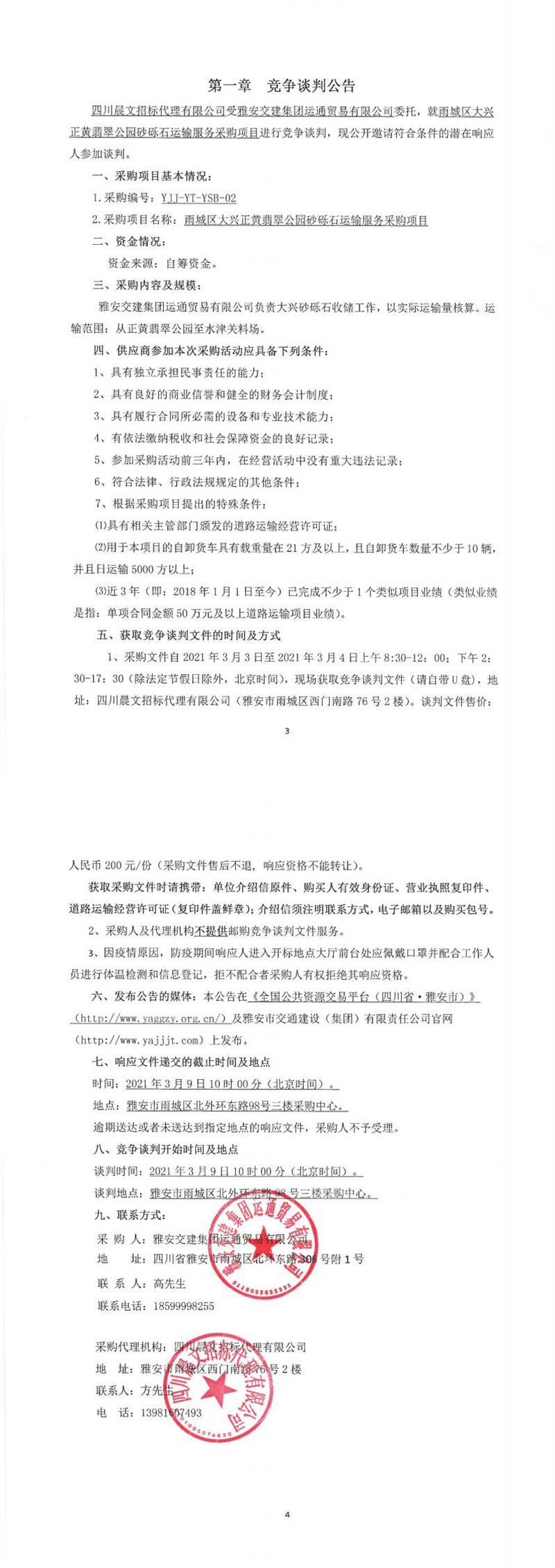雅安交建集團運通貿(mào)易有限公司雨城區(qū)大興正黃翡翠公園砂礫石運輸服務采購項目競爭談判公告