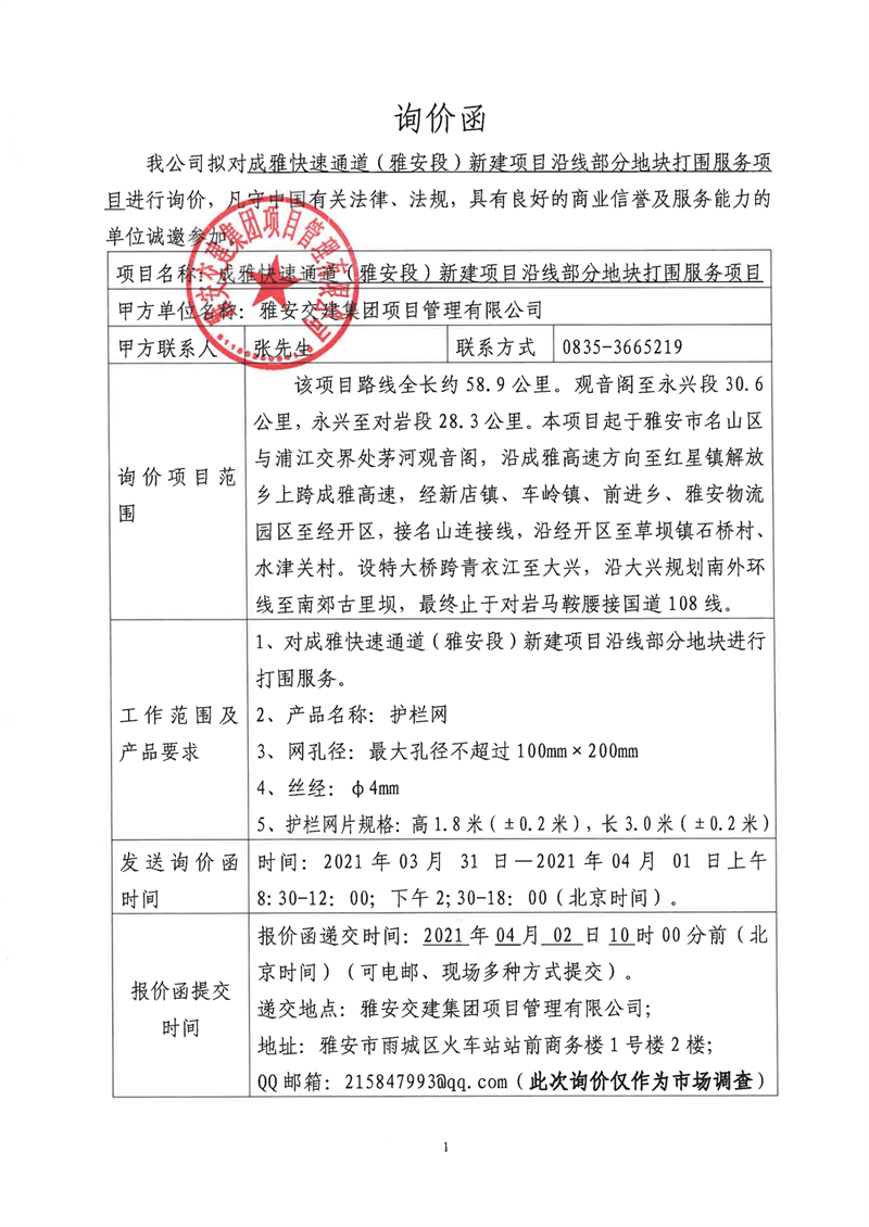 雅安交建集團(tuán)項(xiàng)目管理有限公司成雅快速通道(雅安段)新建項(xiàng)目沿線(xiàn)部分地塊打圍服務(wù)項(xiàng)目詢(xún)價(jià)函