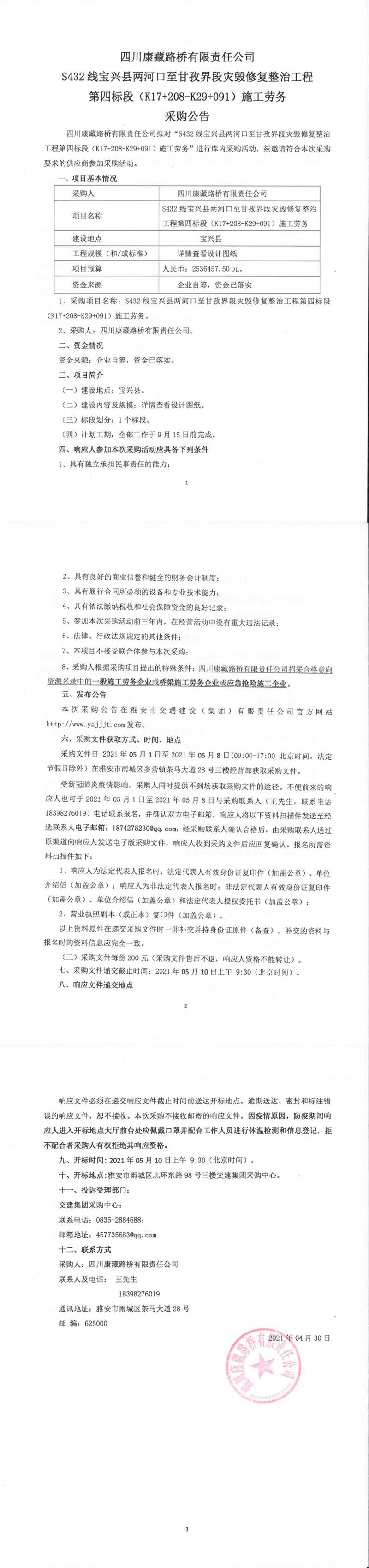 四川康藏路橋有限責(zé)任公司S432線寶興縣兩河口至甘孜界段災(zāi)毀修復(fù)整治工程第四標(biāo)段(K17+208-K29+091)施工勞務(wù)采購公告