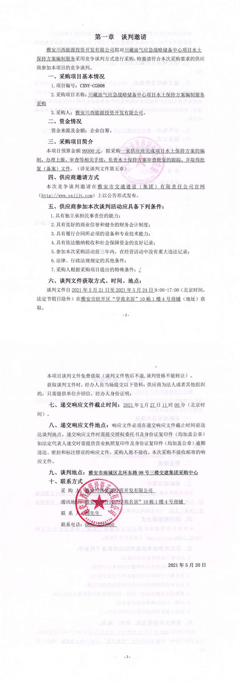 雅安川西能源投資開發(fā)有限公司川藏油氣應(yīng)急戰(zhàn)略儲備中心項(xiàng)目水土保持方案編制服務(wù)采購競爭談判公告