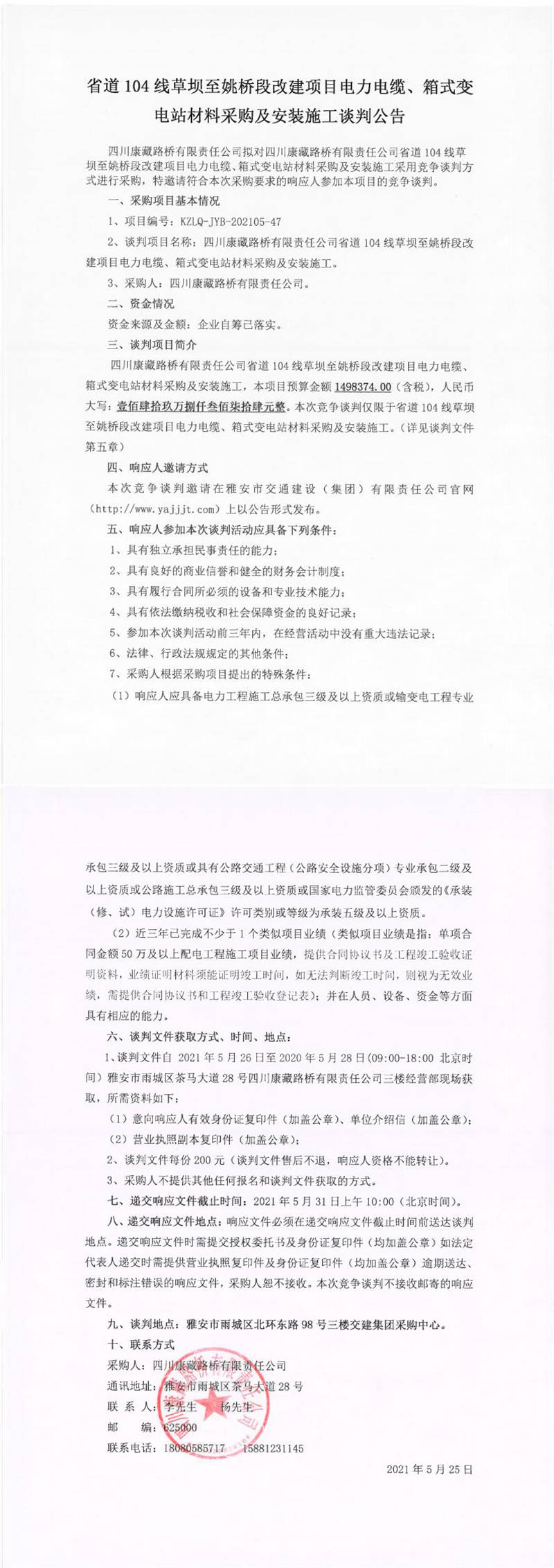 四川康藏路橋有限責(zé)任公司省道104線草壩至姚橋段改建項(xiàng)目電力電纜、箱式變電站材料采購及安裝施工談判公告