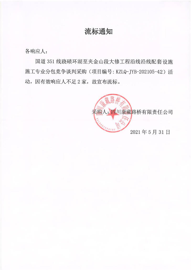 四川康藏路橋有限責任公司國道351線蹺磧環(huán)湖至夾金山段大修工程沿線沿線配套設(shè)施施工專業(yè)分包競爭談判采購流標通知