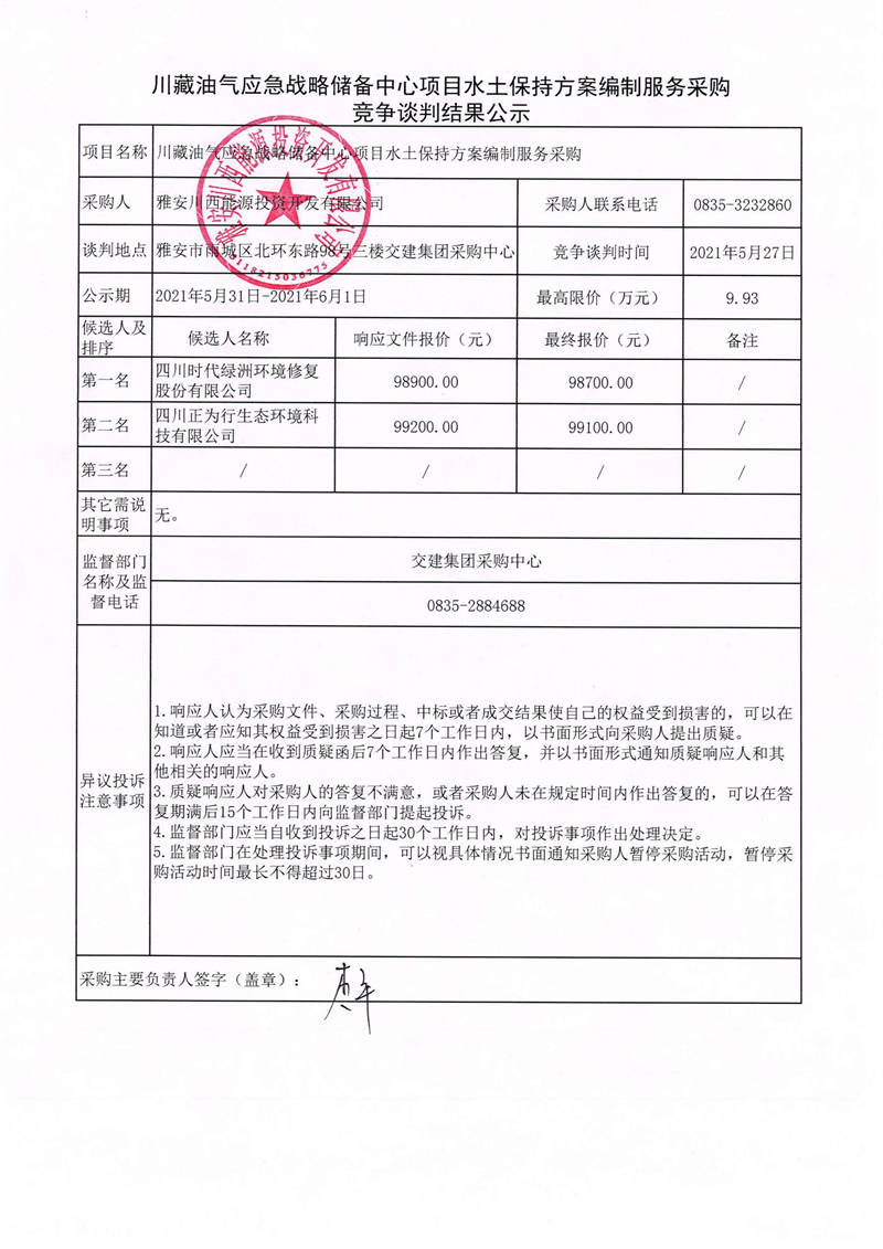 雅安川西能源投資開發(fā)有限公司川藏油氣應(yīng)急戰(zhàn)略儲(chǔ)備中心項(xiàng)目水土保持方案編制服務(wù)采購競(jìng)爭(zhēng)談判結(jié)果公示